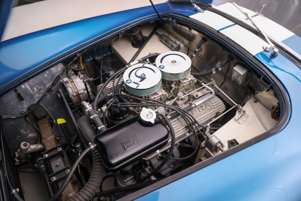 Por dentro, o Shelby Cobra MK II era espartano: bancos envolventes, painel com instrumentos analógicos, volante pequeno instalado à esquerda e a clássica alavanca de câmbio curta, tudo voltado ao compromisso máximo com a condução esportiva.